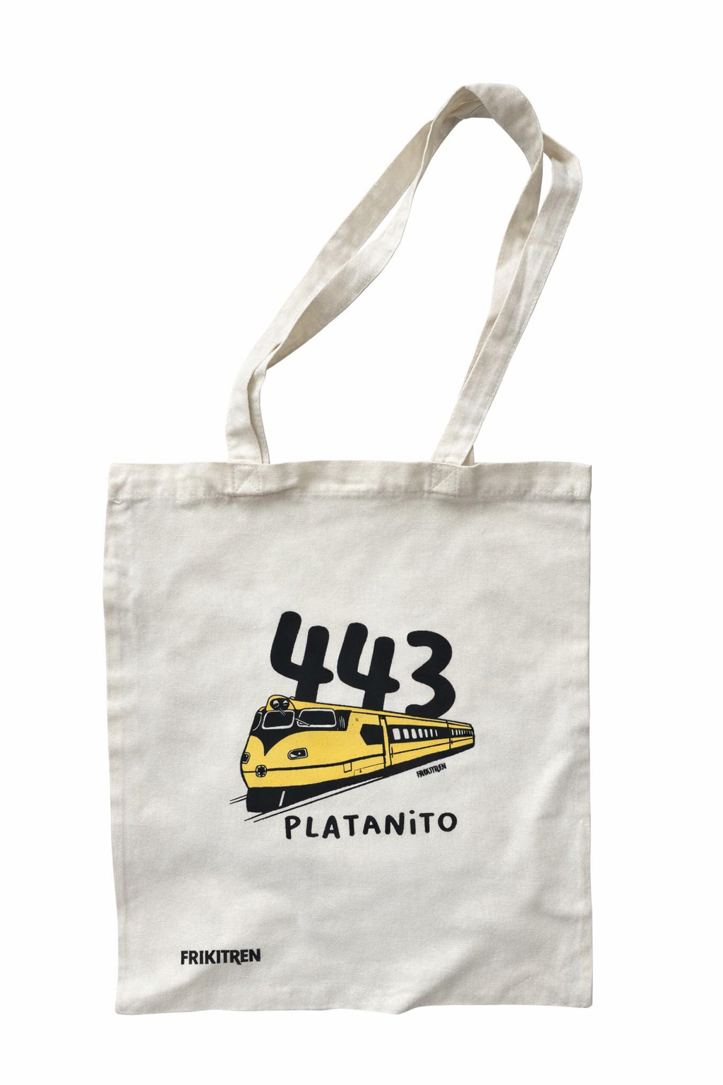 Esta tote bag de algodón 100% natural está dedicada a uno de los trenes más emblemáticos del ferrocarril español: el 443, conocido popularmente como “Platanito” por su característico color amarillo.